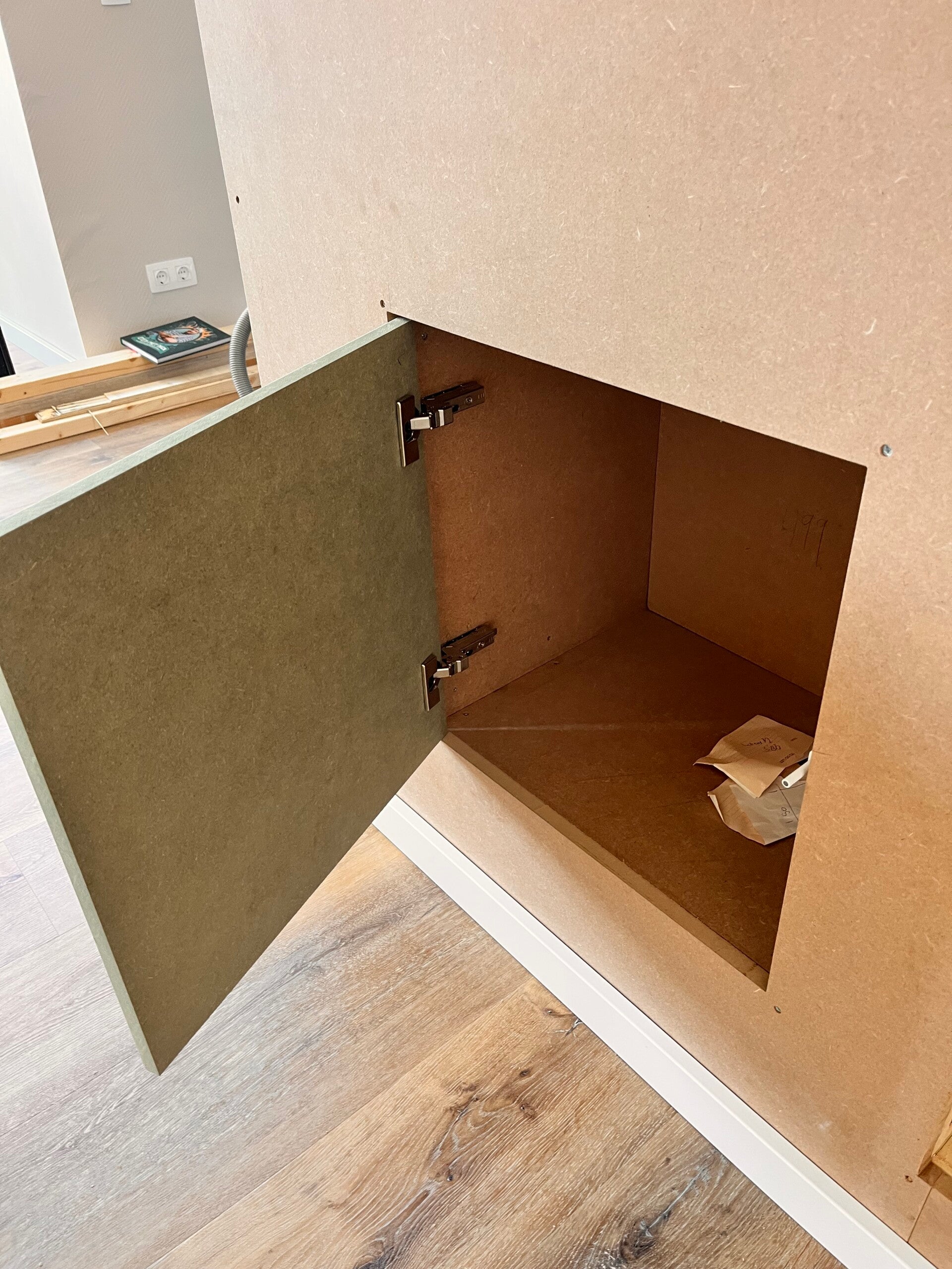Een bijzonder detail van dit project is dat de vloerverwarmingsverdeler op een nette manier is weggewerkt achter het rechter deurtje van de cinewall. Hierdoor blijft de functionaliteit behouden, zonder dat dit afbreuk doet aan het ontwerp.
