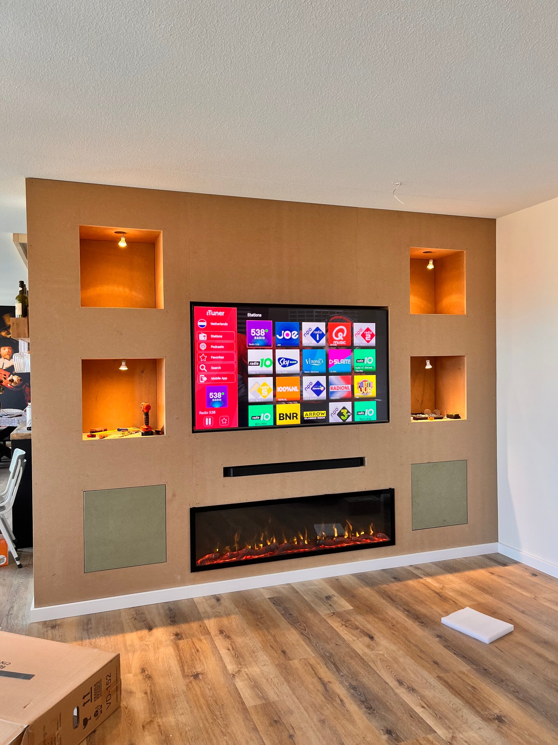 We zijn begonnen met het bespreken van de wensen van de klant. Op basis daarvan is eerst een schets gemaakt, zodat duidelijk werd hoe de cinewall eruit zou komen te zien. Nadat alles akkoord was, zijn we gestart met de bouw. De cinewall is gemaakt van MDF en daarna netjes afgewerkt en geschilderd. Daarnaast is de wand voorzien van geïntegreerde verlichting die op afstand bediend kan worden, een sfeerhaard en praktische opbergruimte.