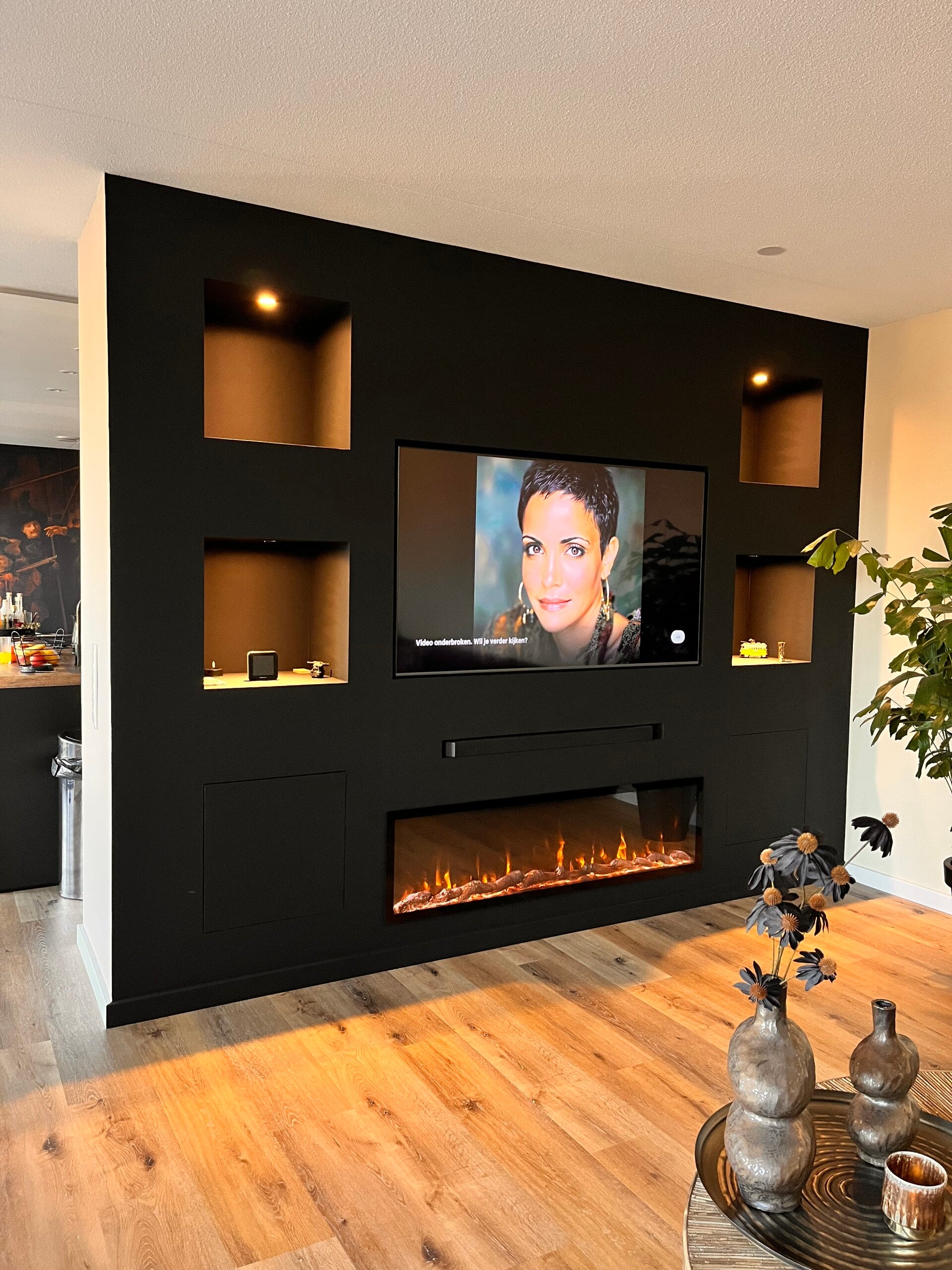 Voor een woning in Spijkenisse hebben we een complete cinewall op maat gerealiseerd. Vooraf was de situatie vrij simpel: een kale wand met aan de rechterzijde een vloerverwarmingsverdeler die in de weg zat voor het ontwerp.