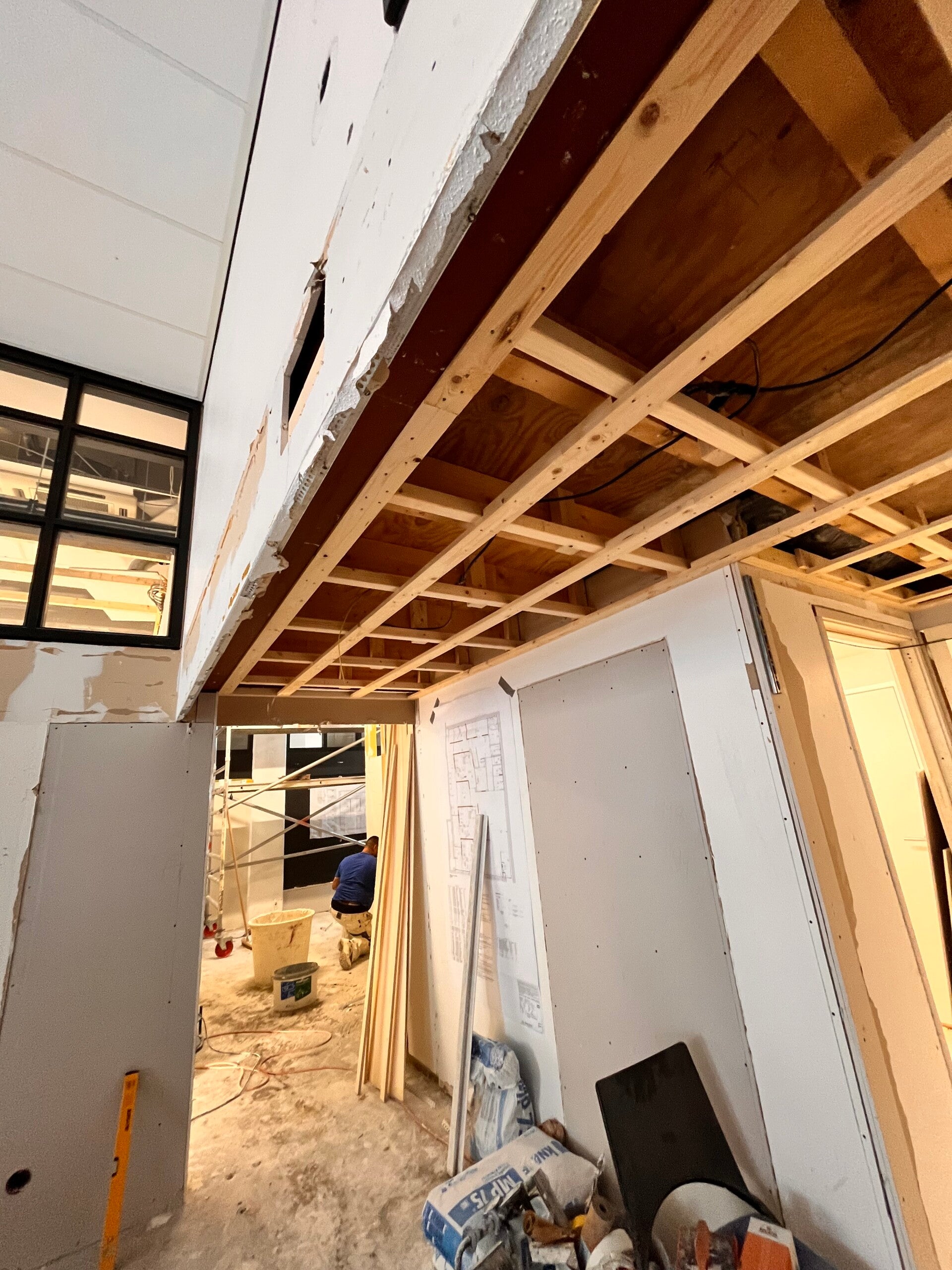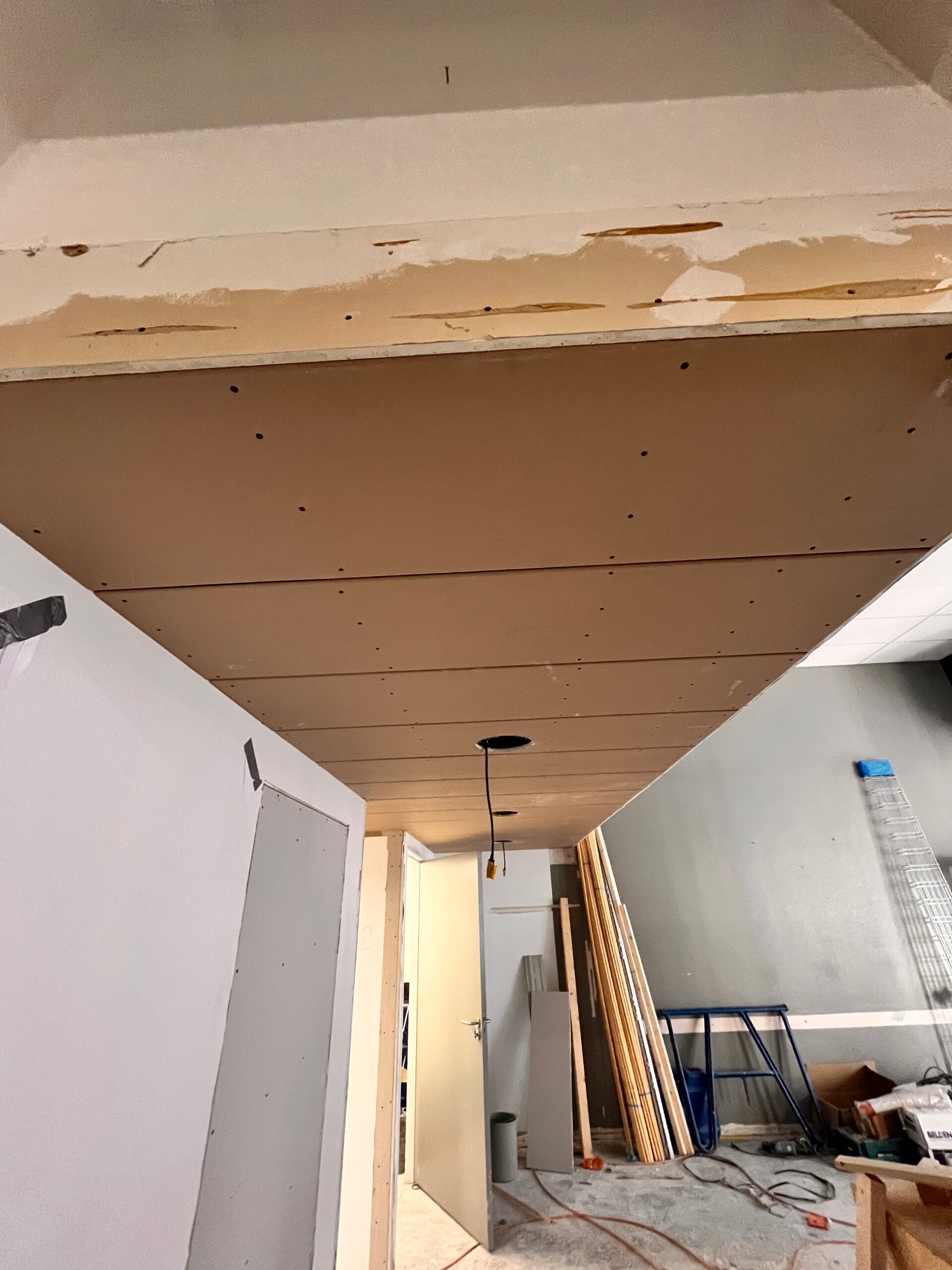 We zijn begonnen met het slopen van het oude plafond. Daarna is het nieuwe plafond uitgeregeld met latten, zodat er een goede basis ontstond voor de verdere opbouw. Vervolgens zijn de gipsplaten gemonteerd. Nadat deze basis gereed was, is de stukadoor langsgekomen om het plafond strak af te werken. Tot slot heeft de schilder het plafond verder netjes afgewerkt.